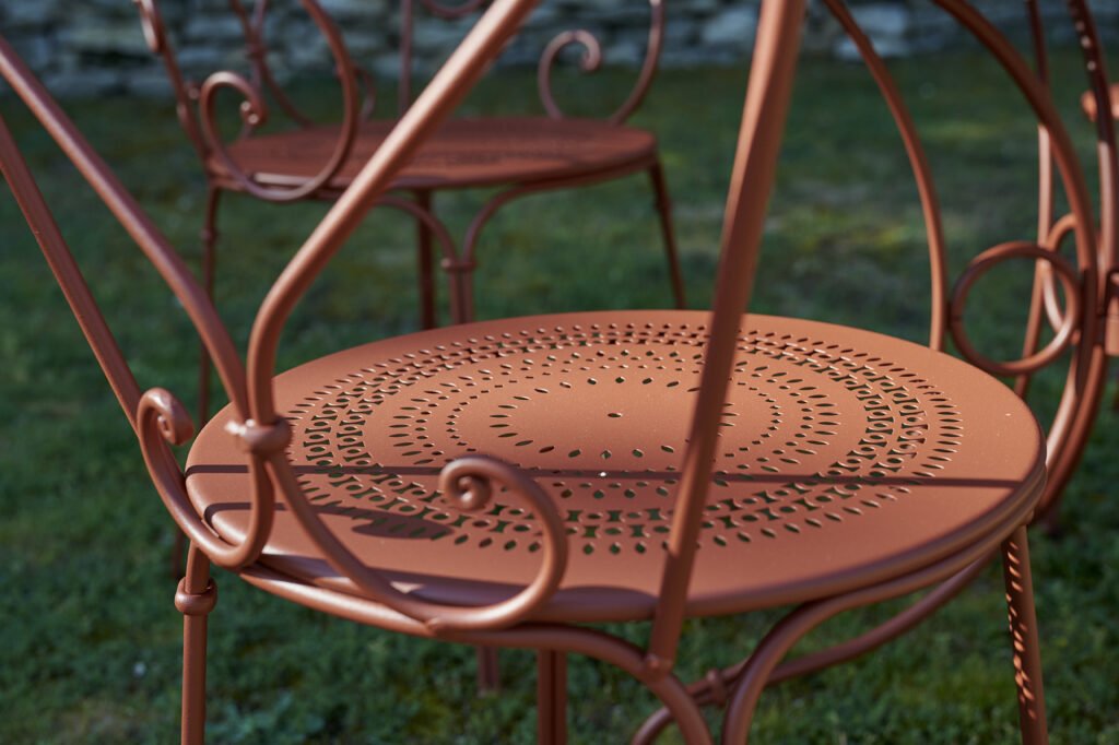 Romantische klasssieke stoel van zeer stevige en zware kwaliteit. De zitting is van geperforeerd staal. Leverbaar in de vermelde Fermob kleuren.