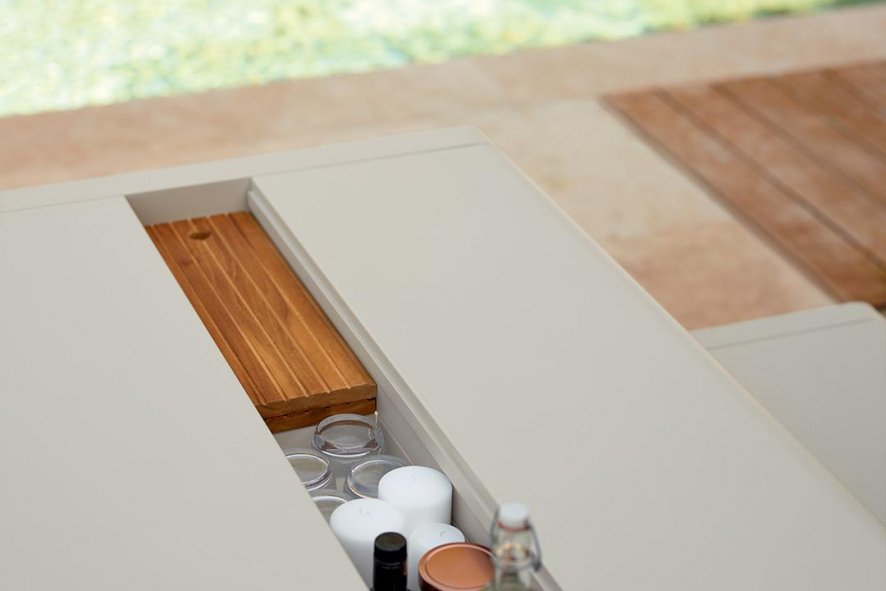 In het midden van de tafel is een opslagruimte (16,5 cm breed) gecreëerd die afgedekt wordt door 4 teakhouten afdekplanken.