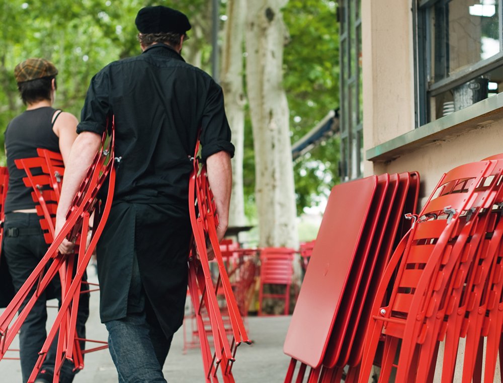 Handige opklapbare kleine vierkante tafel van 57 bij 57 cm uit de serie Bistro van Fermob. Gemaakt van gelakt staal. Gewicht is 8 kg. De hoogte van het blad is 74 cm.