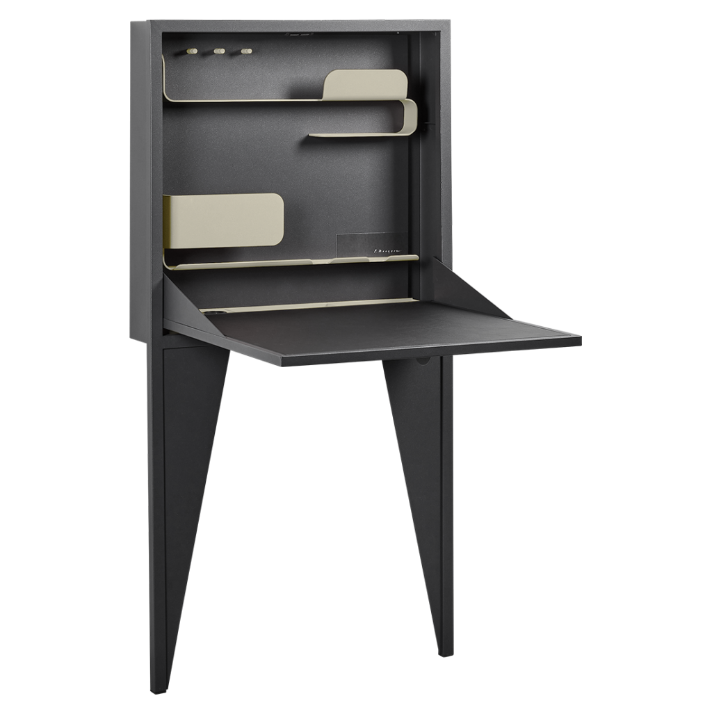 De Fermob Face A Face: Het Face à Face-bureau won zijn ontwerper, Pascal Mourgue, de Grand Prix de la Création-prijs in 1985. Nu heeft Fermob, tot grote vreugde van fans overal ter wereld, dit iconische stuk opnieuw uitgebracht met wat extra, moderne accenten. Face à Face is geïnspireerd op het houten bureau met vakjes voor snuisterijen dat ooit een steunpilaar van elk huis was – en een uitstekende illustratie van Fermob’s traditionele knowhow en expertise op het gebied van metaalbewerking. Het is perfect voor intieme momenten alleen. De opklapbare deur is voorzien van een bureaulegger van imitatieleer, waar u ansichtkaarten kunt schrijven, een notitie aan uw agenda kunt toevoegen of zelfs uw boekhouding kunt doen – en dat allemaal terwijl u naar uw favoriete nummers op uw smartphone luistert terwijl deze wordt opgeladen. De bijgewerkte versie van Face à Face is nu geschikt voor de 21e eeuw, compleet met twee USB-poorten, een stopcontact en slimme opbergvakken die uit het zicht zijn verborgen. Ondertussen hebben de snuisterijschalen hun eigen visuele aantrekkingskracht en zijn ze verkrijgbaar in drie kleuren. Voor welke ga jij: Cactus, Clay Grey of Honey? Maar dat is niet alles. Dit design-geïnspireerde bureau bevat ook een sleutelhanger, tijdschriftenrek, brievenrek, brillenhouder en smartphone- of tablethouder. Maar ondanks al deze functies kan Face à Face nog steeds plat worden opgevouwen, waardoor het minimale ruimte in beslag neemt in uw slaapkamer of woonkamer. De antracietkleurige buitenkant voegt een elegante toets toe aan elk interieur. Dus als Face à Face u aanspreekt, waarom zou u zich dan niet laten verwennen? De beste manier om van de verleiding af te komen is immers door eraan toe te geven!