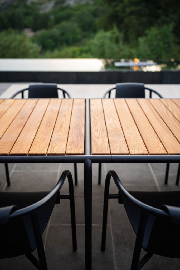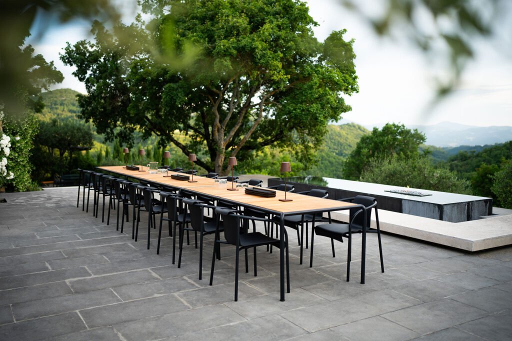 Aan de Houe Avanti Tafel 222×98 kunnen 4 personen zitten, het is gemaakt van van gepoedercoat zwart staal met een tafelblad in gemaakt van Pine of Thermo Ash.