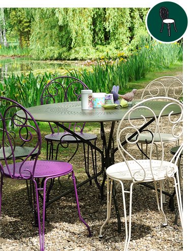 De Montmartre fauteuil combineert het romantische design van de collectie met extra zitcomfort. De sierlijke armleuningen en het stevige stalen frame maken deze stoel ideaal voor ontspannen buiten zitten.