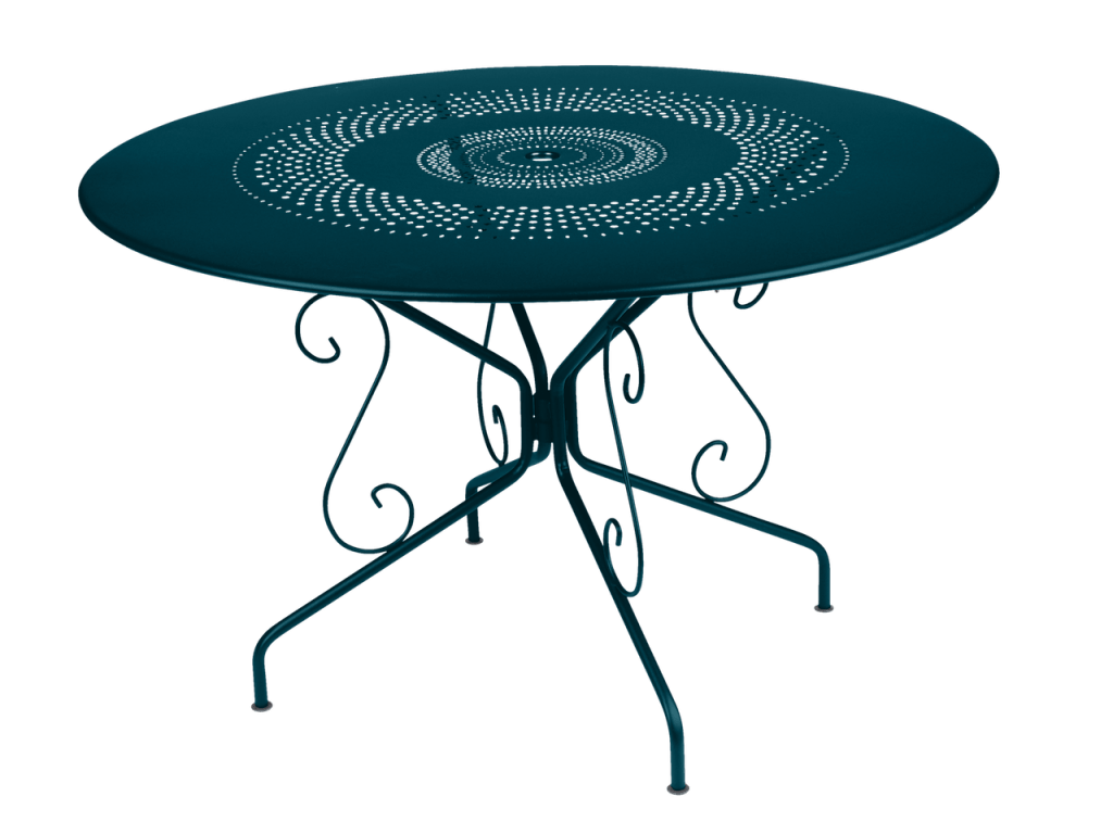 De Fermob Montmartre tafel Ø96 cm heeft een klassiek onderstel met sierlijke lijnen en een geperforeerd stalen blad. Dankzij de duurzame coating is de tafel perfect geschikt voor buitengebruik. Ideaal voor 4 personen.